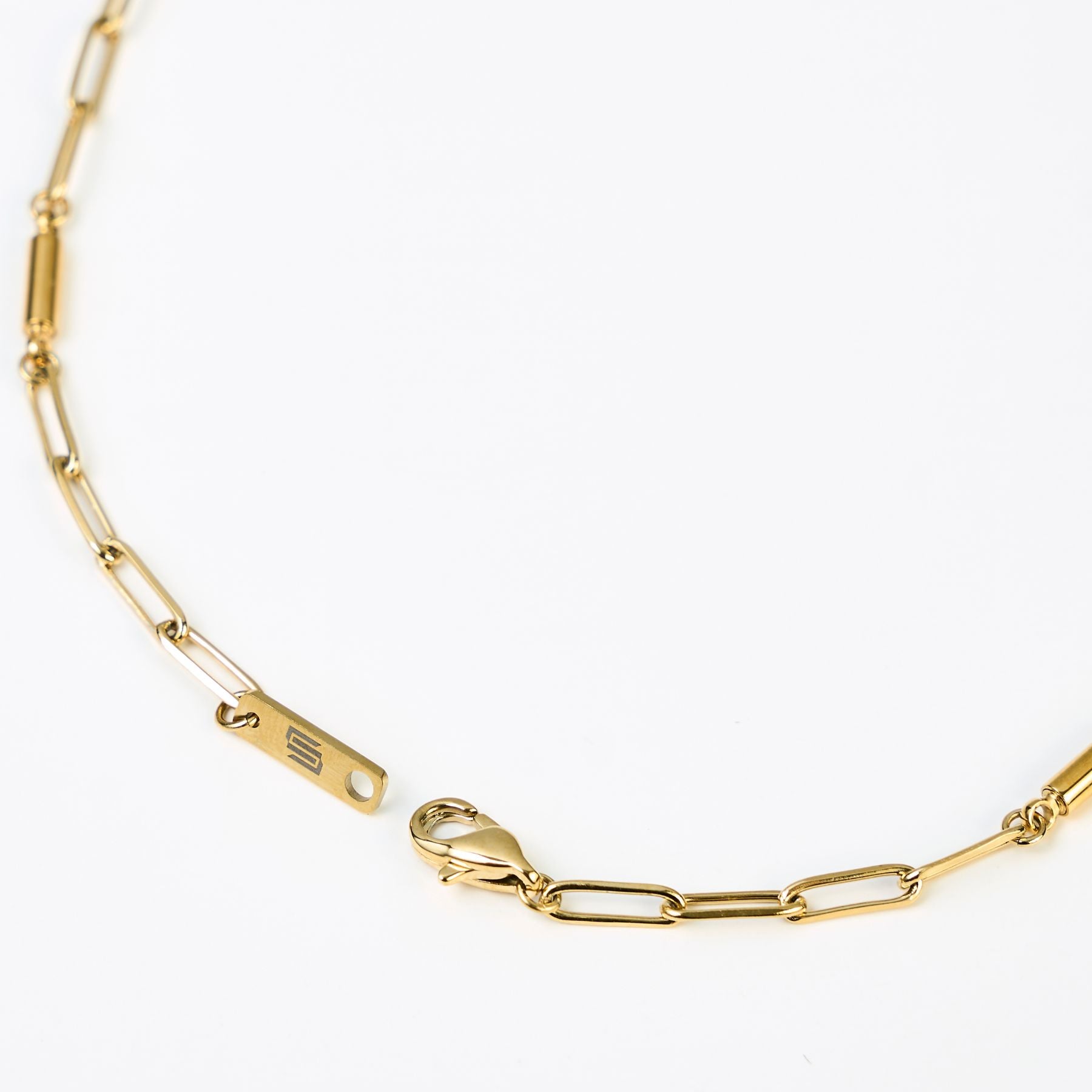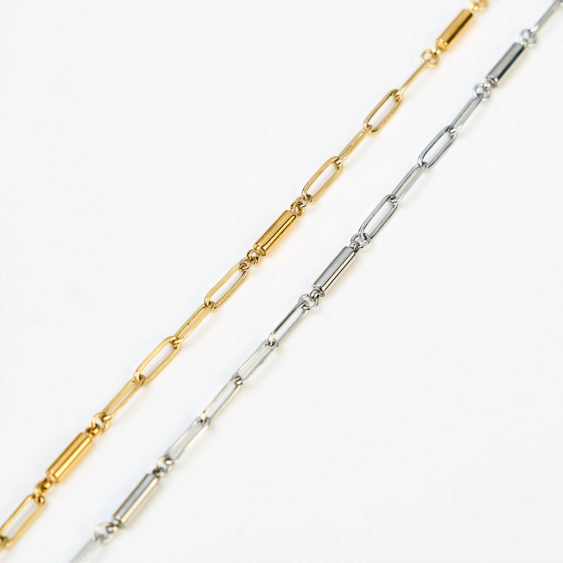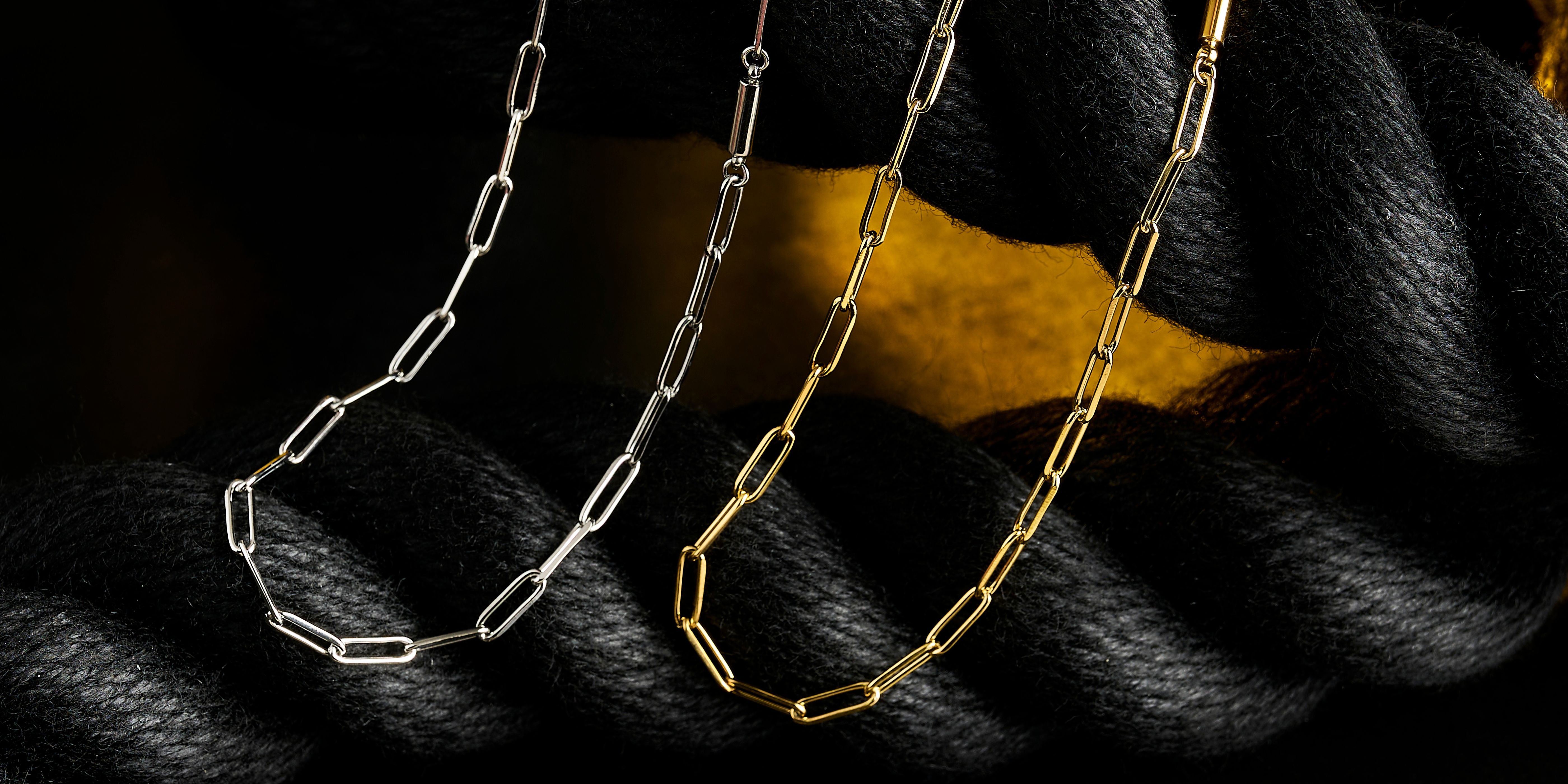 直線的でミニマルなフォルムは、どんなスタイルにも自然に馴染みながら、首元に程よい存在感をプラスします。シンプルでありながら、確かな印象を残すチェーンです。